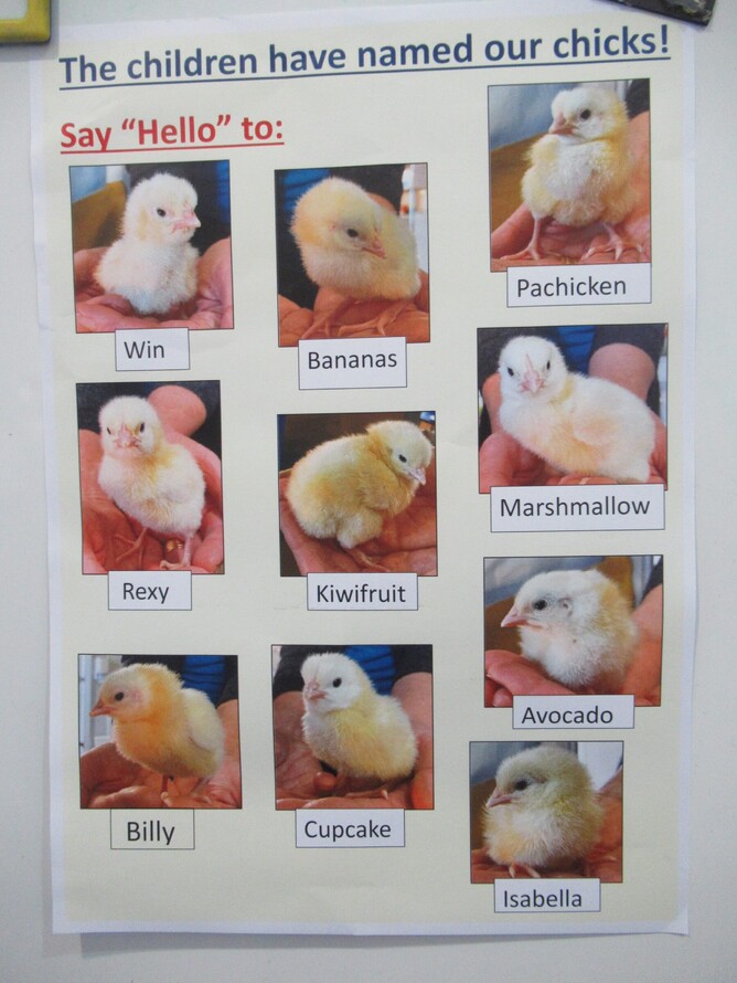 Some children gave the chicks names, and we put their photos on the wall so we could remember what they looked like.