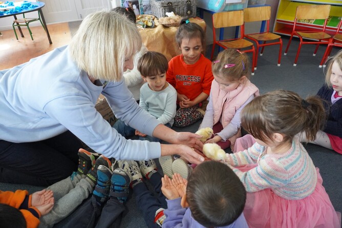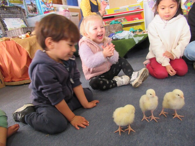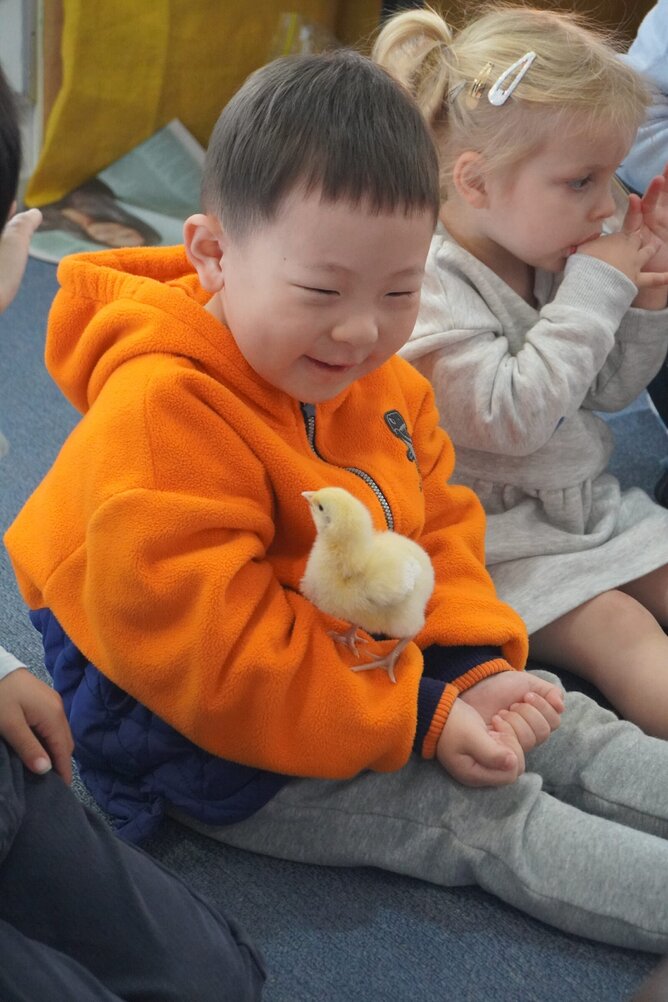 It was very exciting when we finally got to hold the fluffy little chicks. After washing our hands we sat on the floor and the teachers carefully gave the chicks to children to hold. Sometimes they sat in our hands or on our knees, and other times they wanted to walk about on our arms or legs!